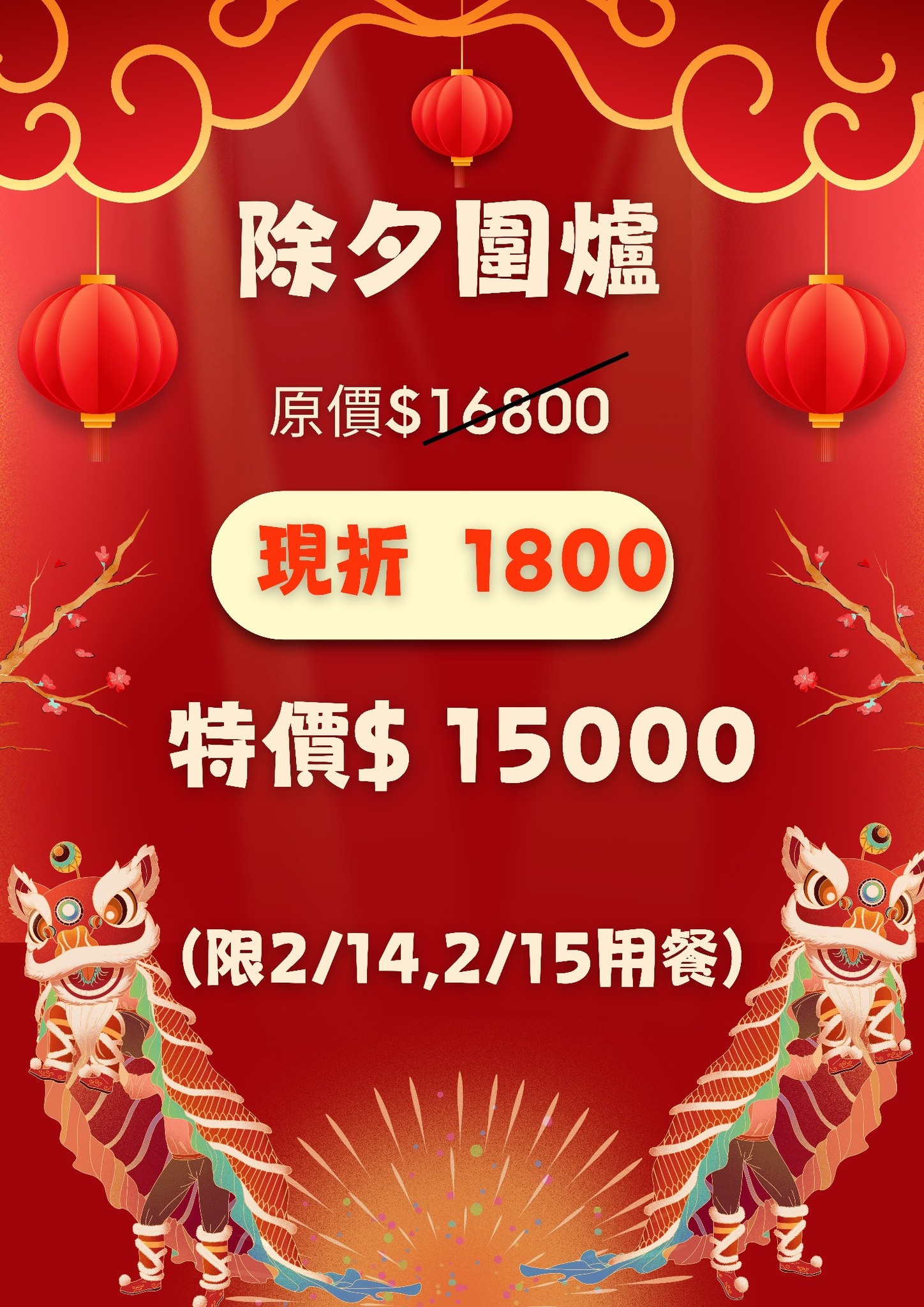 原價 $16,800 ➤ 現折 $1,800,特價 $15,000(限 2/14、2/15 用餐)