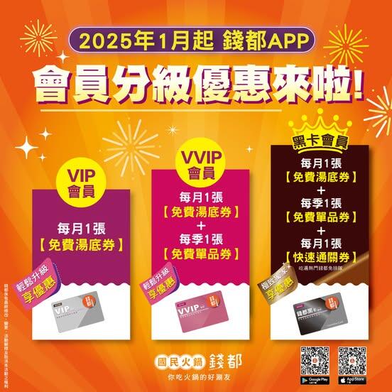 1.前述等級優惠僅限錢都日式涮涮鍋使用
