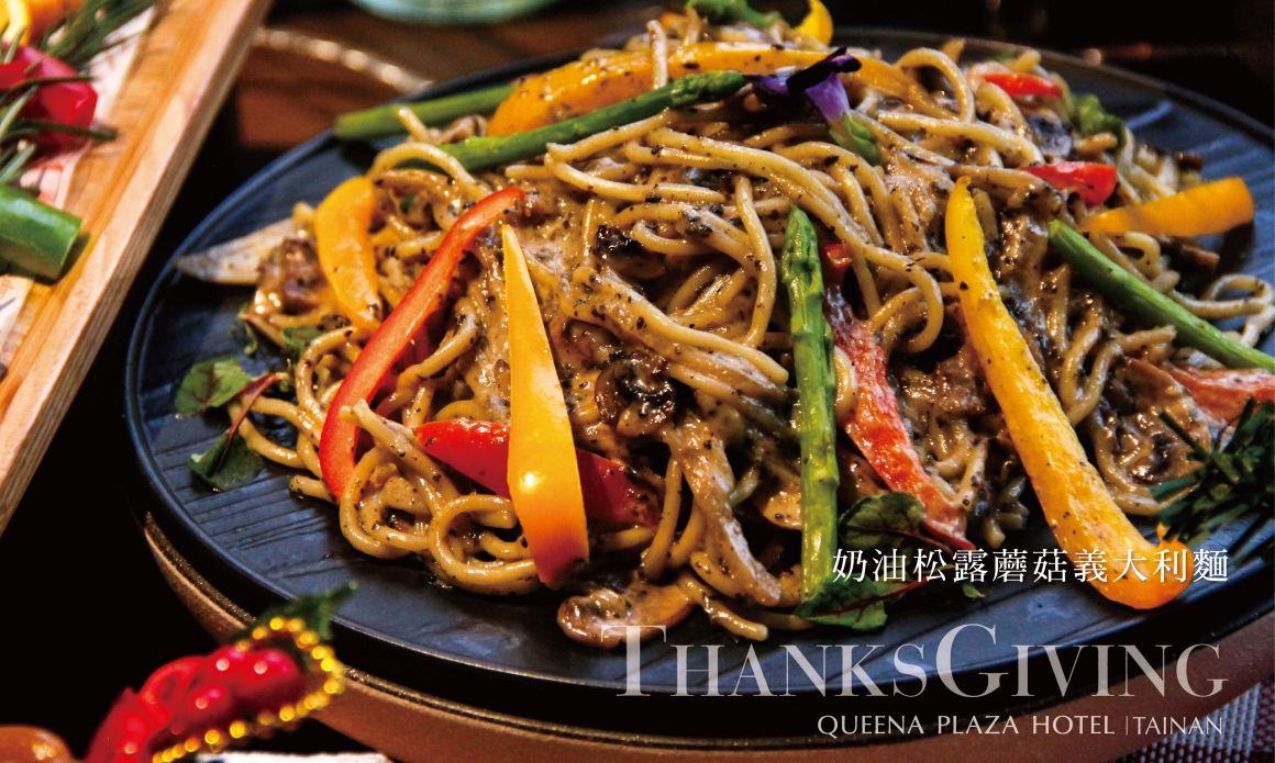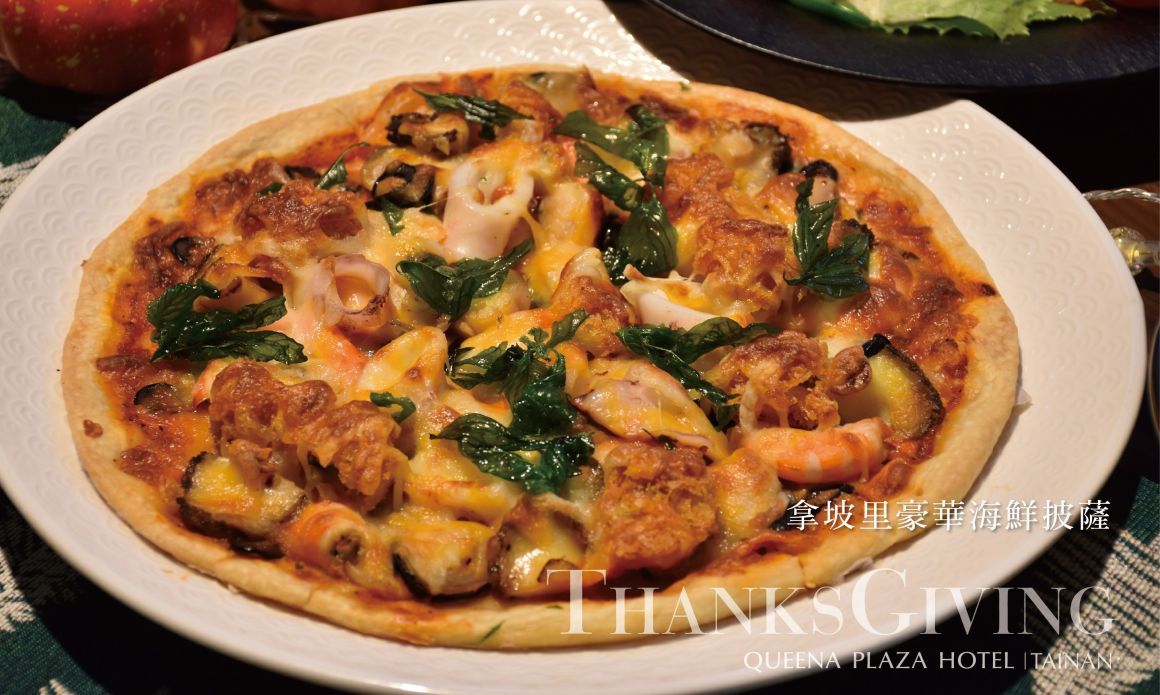 義式香料桂丁烤雞、奶油松露蘑菇義大利麵、拿坡里豪華海鮮披薩、地中海輕食沙拉、水果蛋糕、法國長棍、