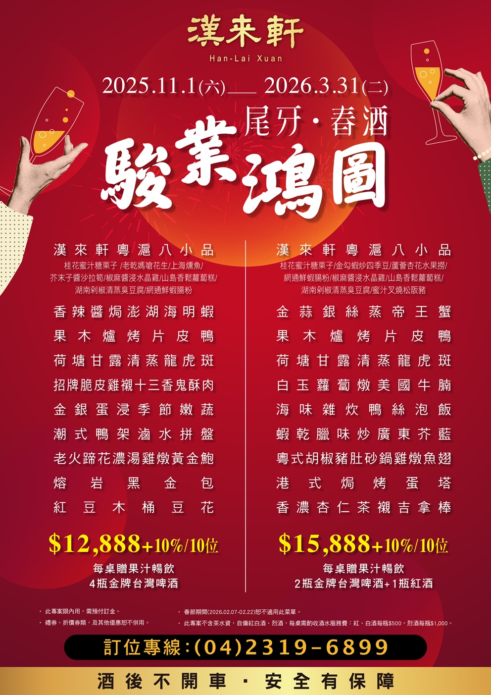 - 方案𝐁 每桌$15,888🍾附贈果汁暢飲+金牌啤酒2瓶+紅酒1瓶