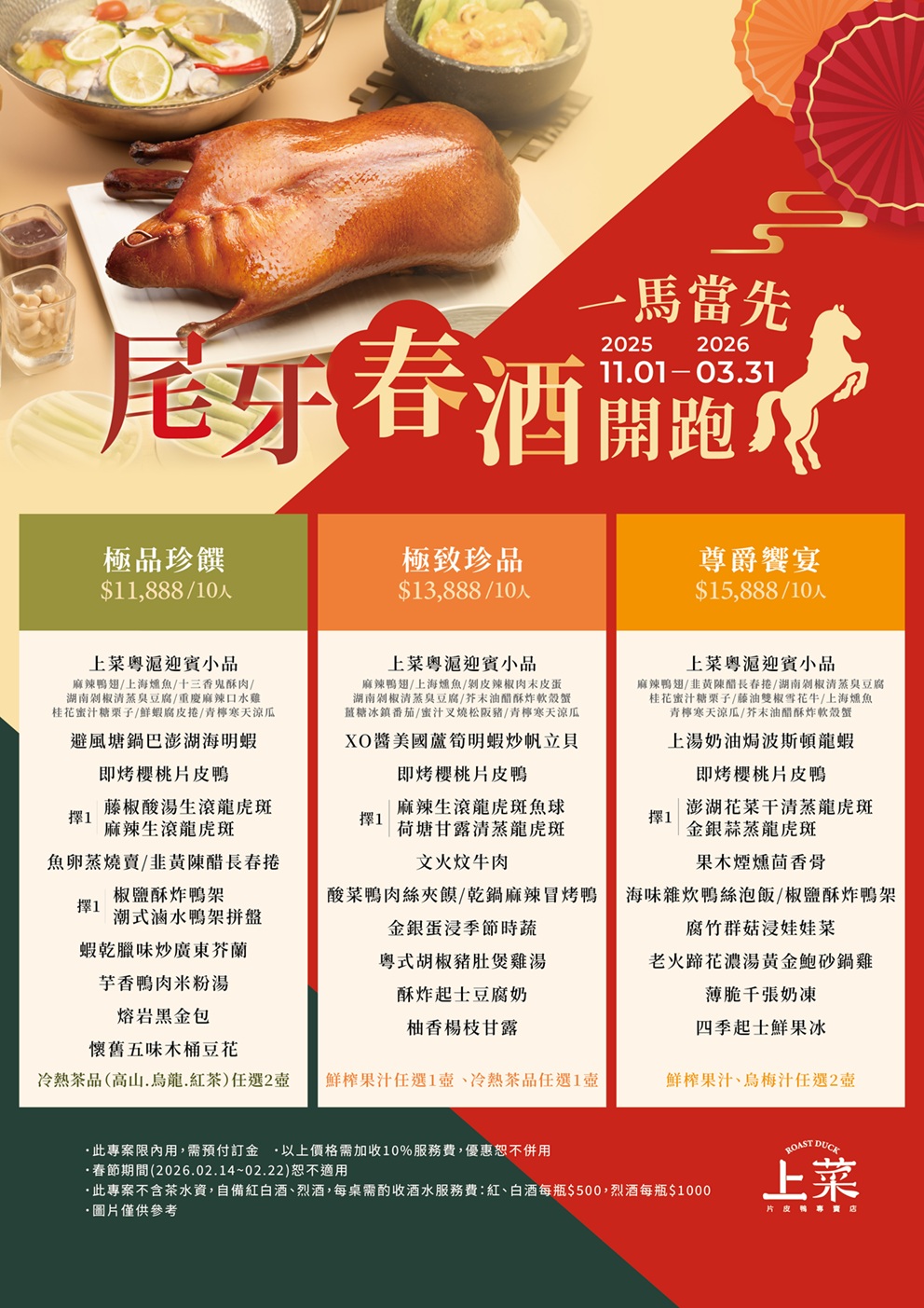 - 尊爵饗宴 NT$15,888/10位 贈送鮮榨果汁、烏梅汁 任選2壺