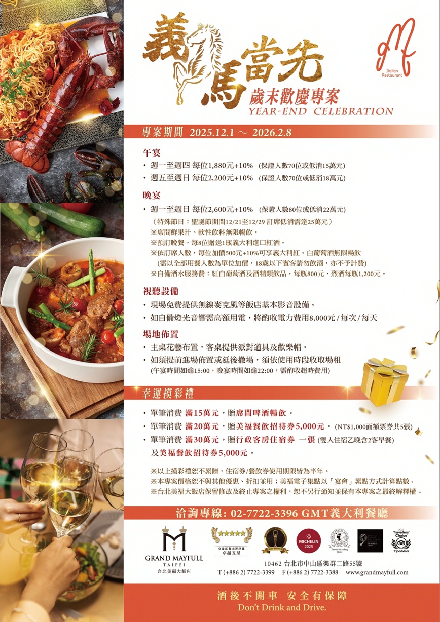 不論是聖誕朋友歡聚Party,或是年終尾牙宴,位於飯店四樓的GMT義大利餐廳,由義籍主廚推出豐盛的義大利風味饗宴,為2025年增添難忘的回憶。