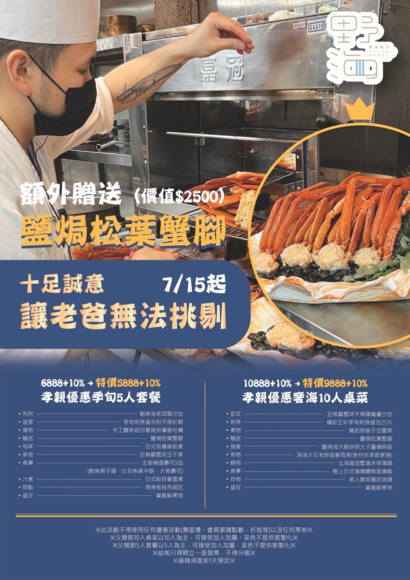 父親節就快到啦~野海壽司推出超棒的孝親優惠孝親優惠季旬5人套餐 原價6888+10% → 特價5888+10%