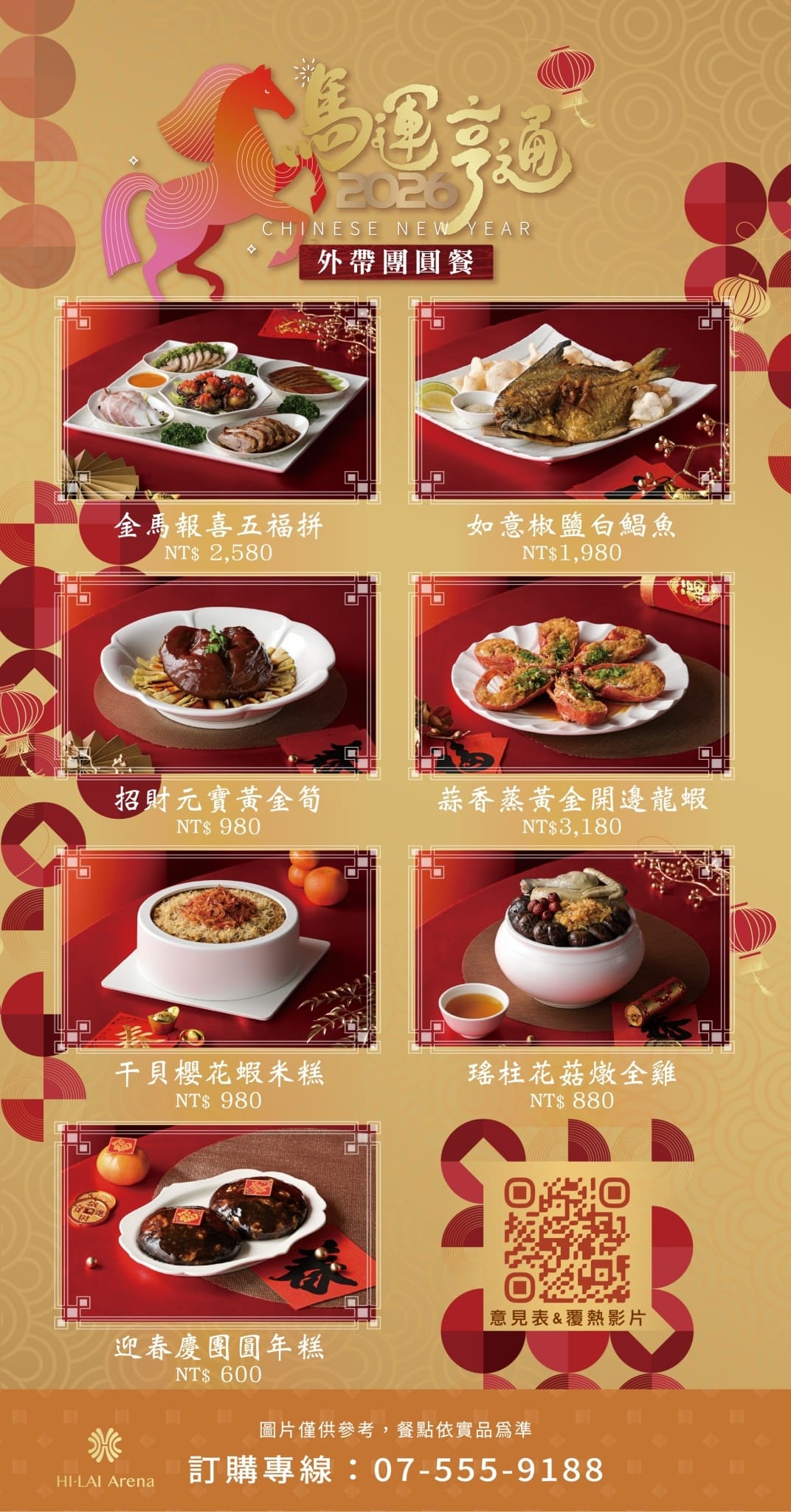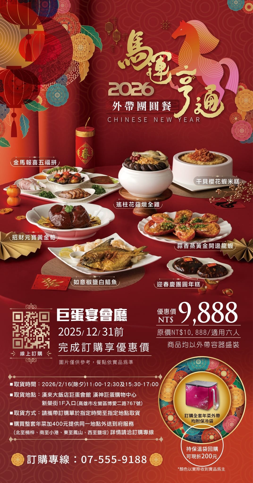 2026馬運亨通除夕外帶團圓餐,北高雄首席宴會場地五星飯店外帶年菜登場,道道山珍海味宅家輕鬆享用五星料理,6菜1甜點 現折$1,000!早鳥優惠價$9,888元(原價$10,888)附贈「精美保溫袋」乙只。整套團圓餐可加價400元享指定地區外送到府服務