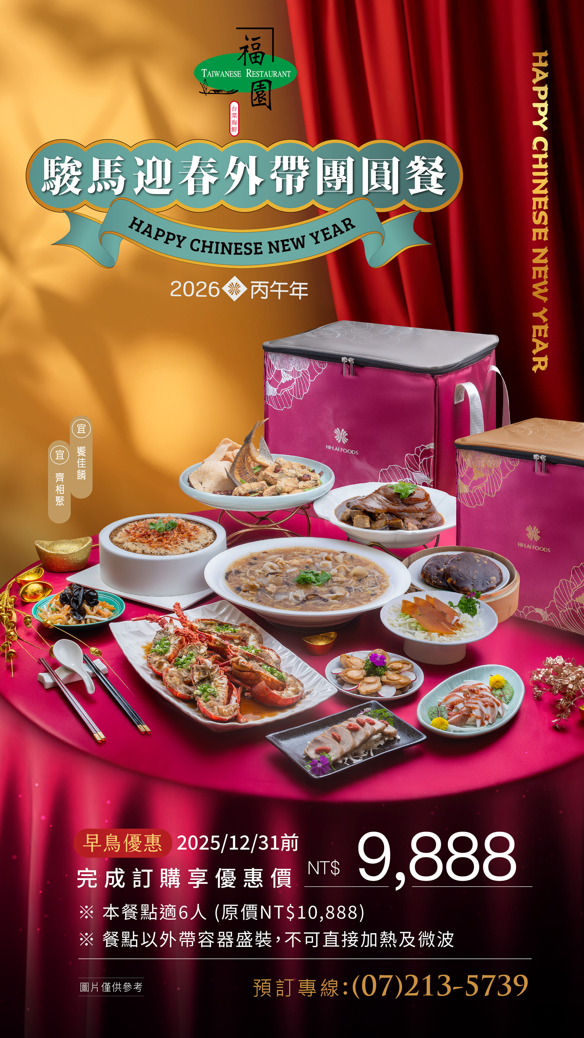 五星飯店美味‧饕客最愛首選「駿馬迎春除夕外帶團圓餐」高雄五星台菜餐廳福園年度鉅獻,道道都是美食家認證的美味,6菜1甜點 現折$1,000!早鳥優惠價$9,888(原價$10,888)附贈「精美保溫袋」乙只。整套團圓餐可加價400元享指定地區外送到府服務。